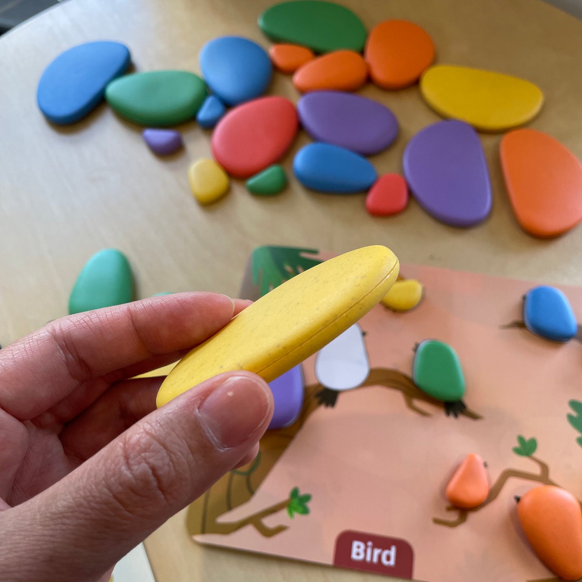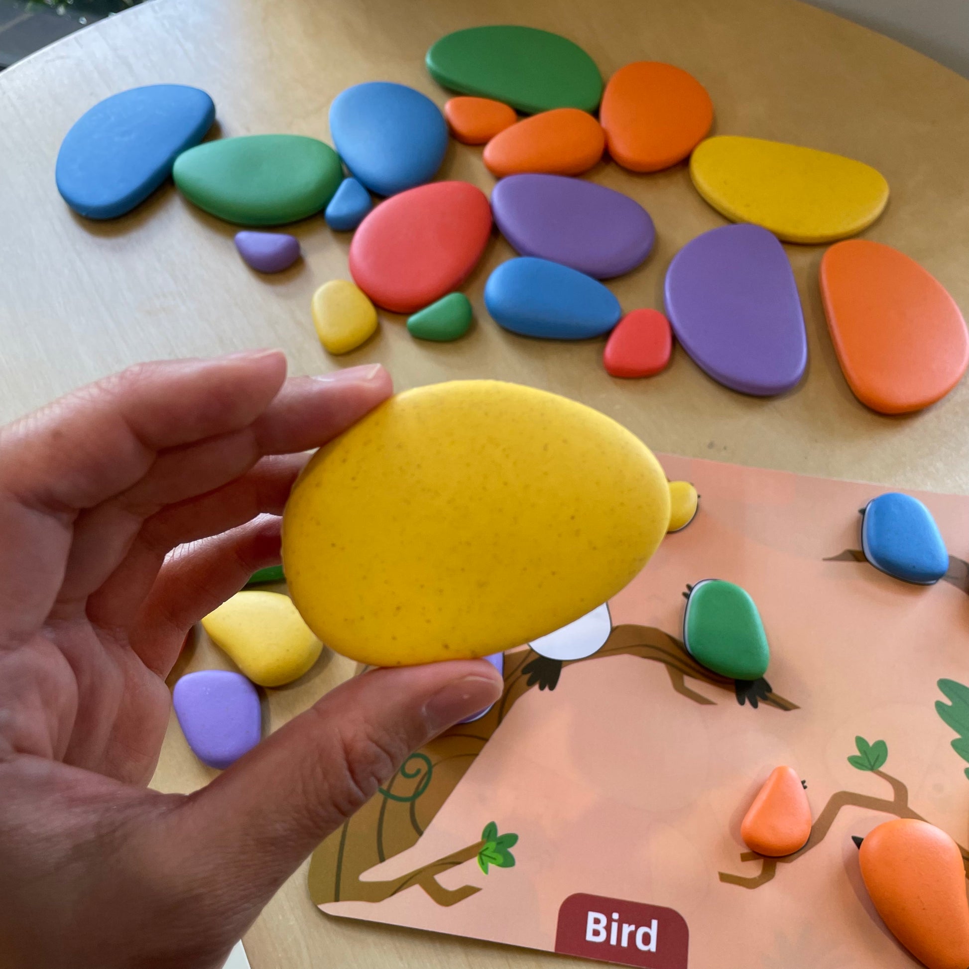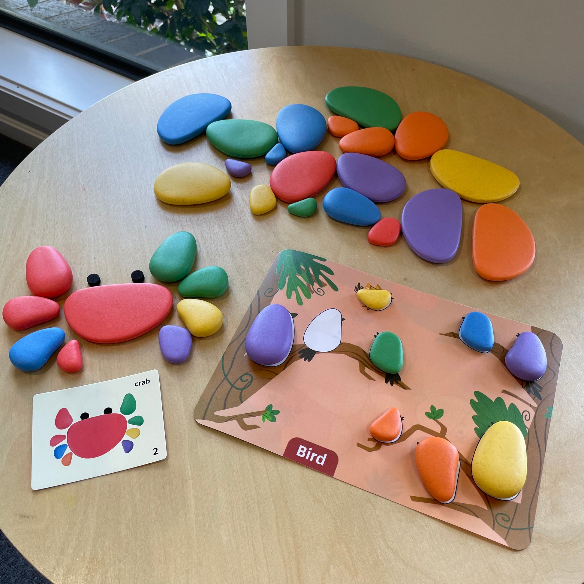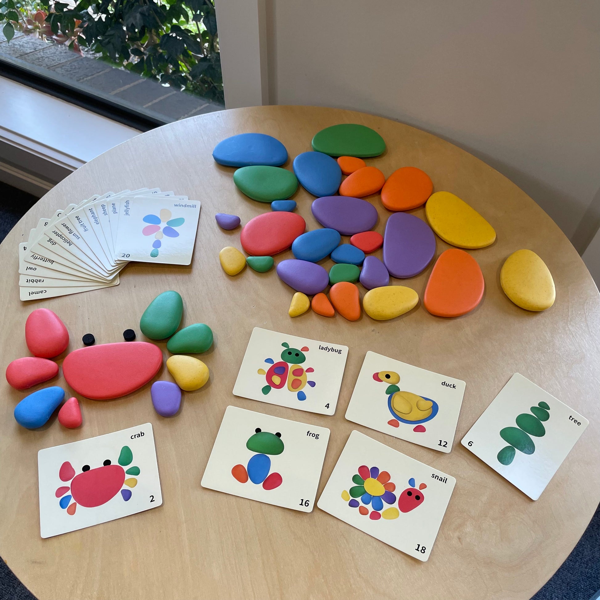 Set includes 10 double-sided activity templates, 20 building inspiration cards and 37 stones in various sizes.