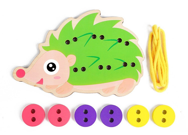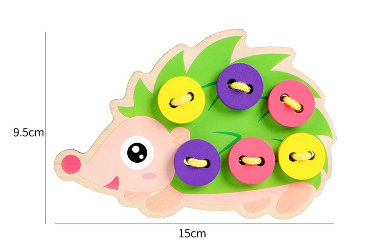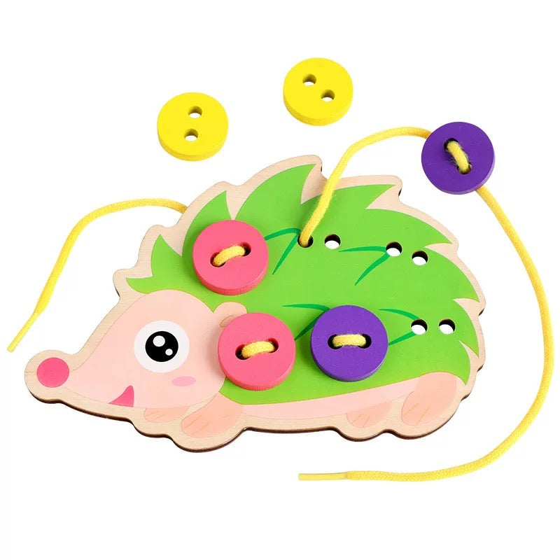 Our Lacing & Threading Wooden Hedgehog is designed to improve hand-eye coordination and fine motor skills. This engaging toy allows children to enhance their essential abilities while adorning the cute animal's coat with colorful buttons.