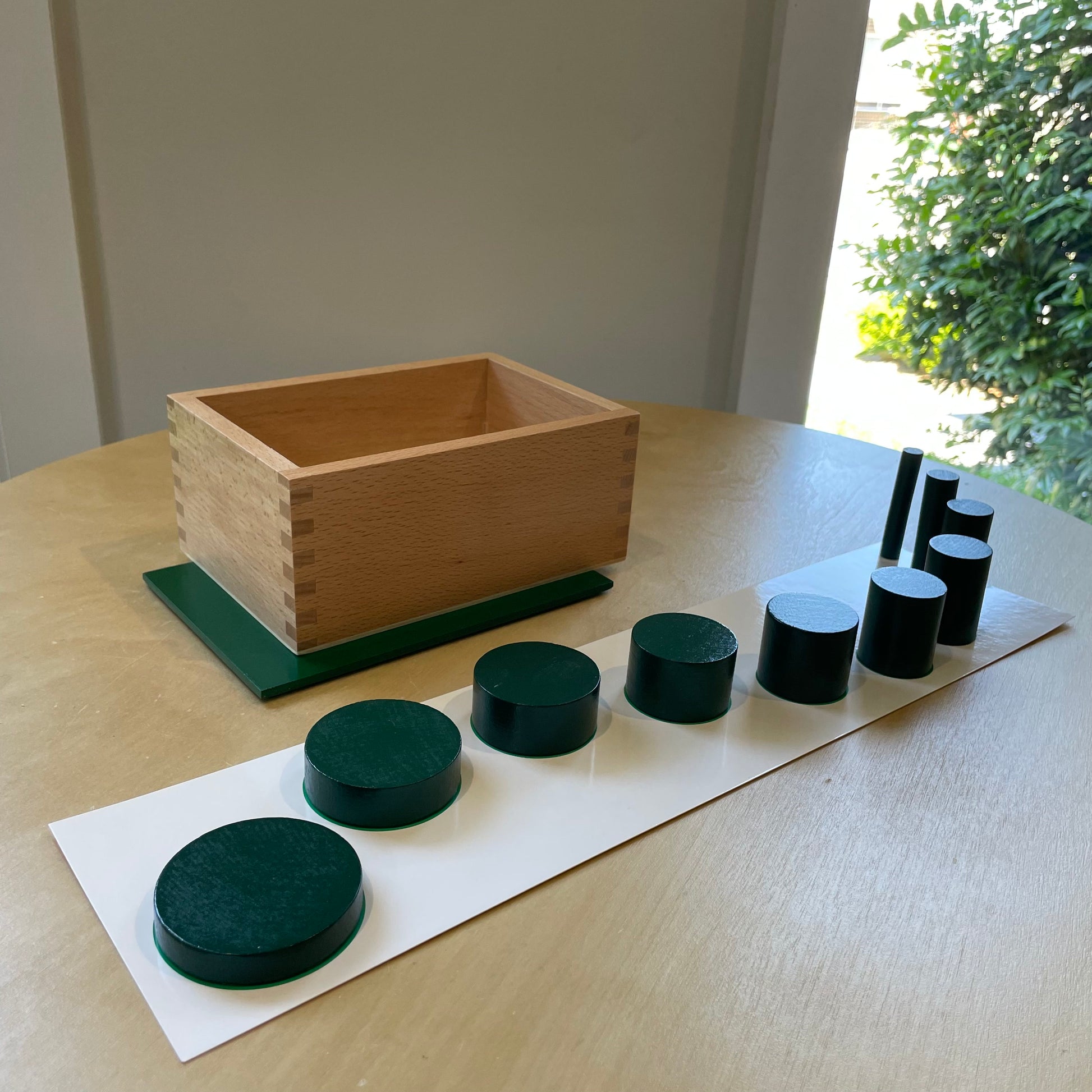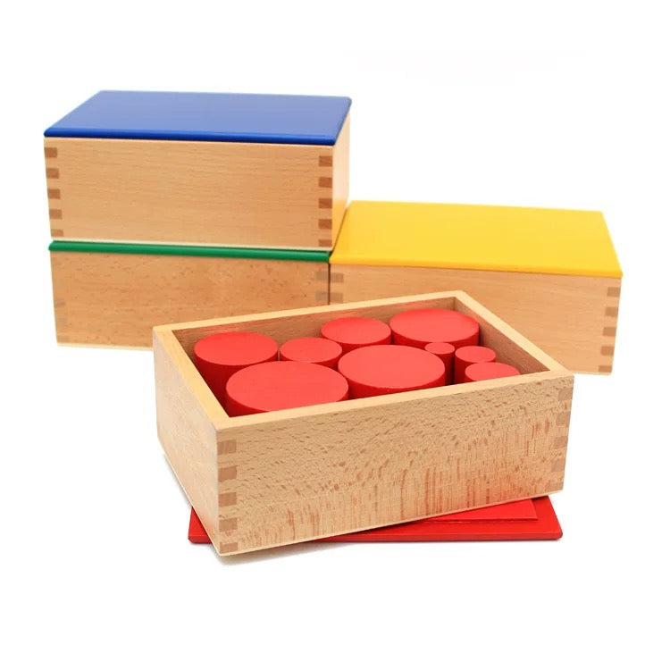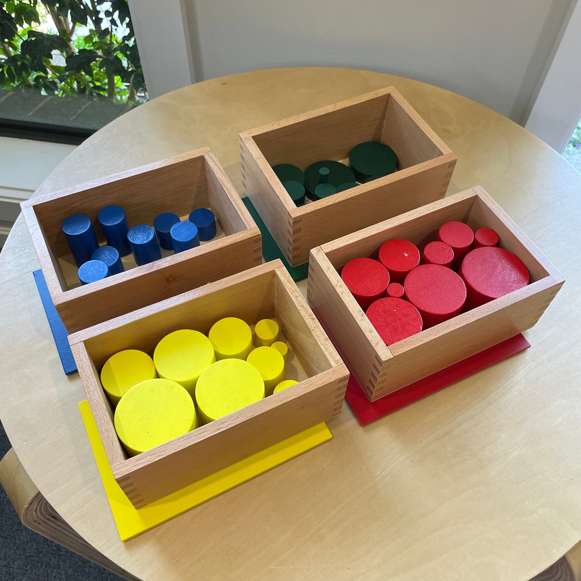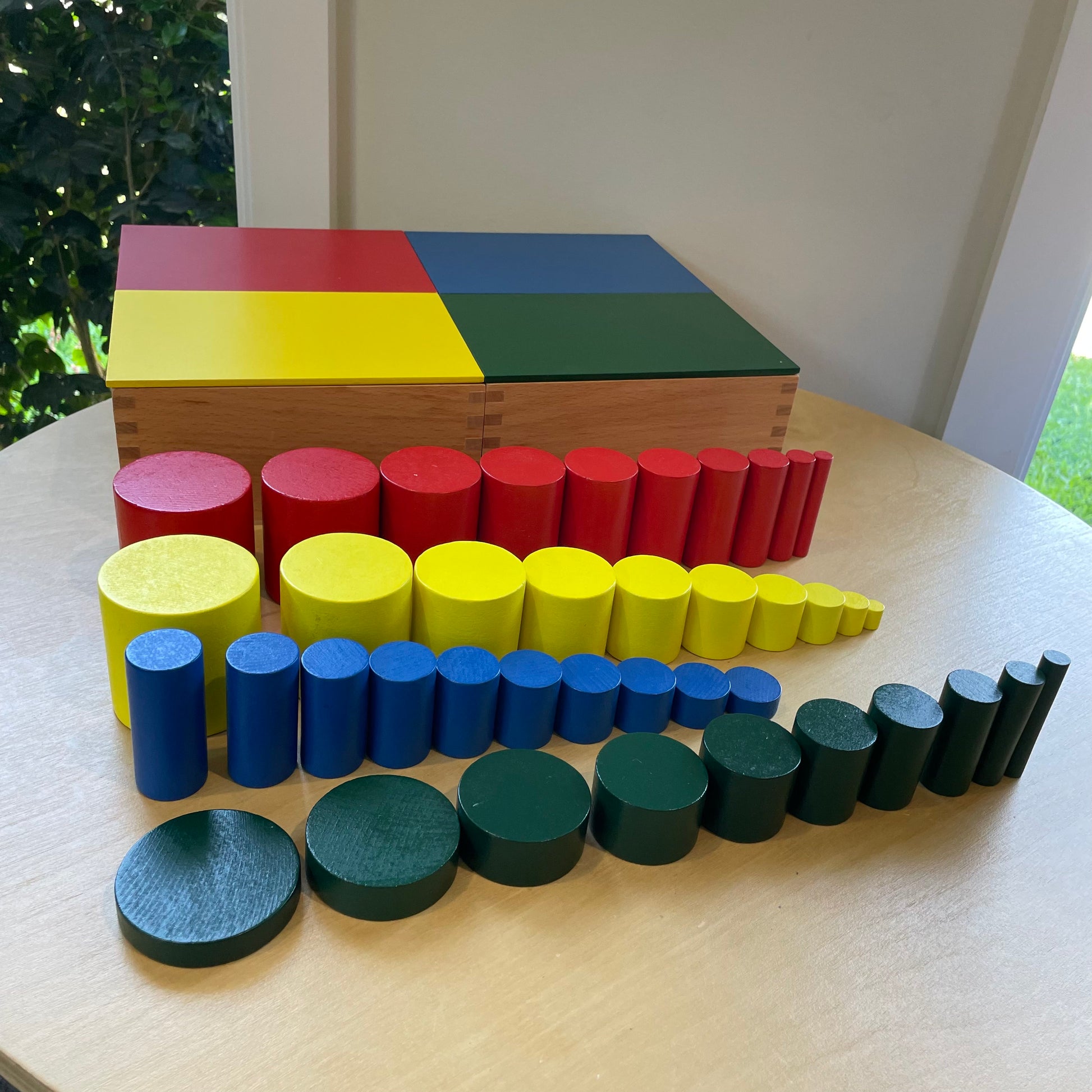The Knobless Cylinders are the final stage in the dimensional material where the child, based upon his ability to discriminate, places the individual sets of cylinders in the correct order. Each set of ten cylinders are contained in a separate beechwood box with the lid painted the same color as the cylinders.