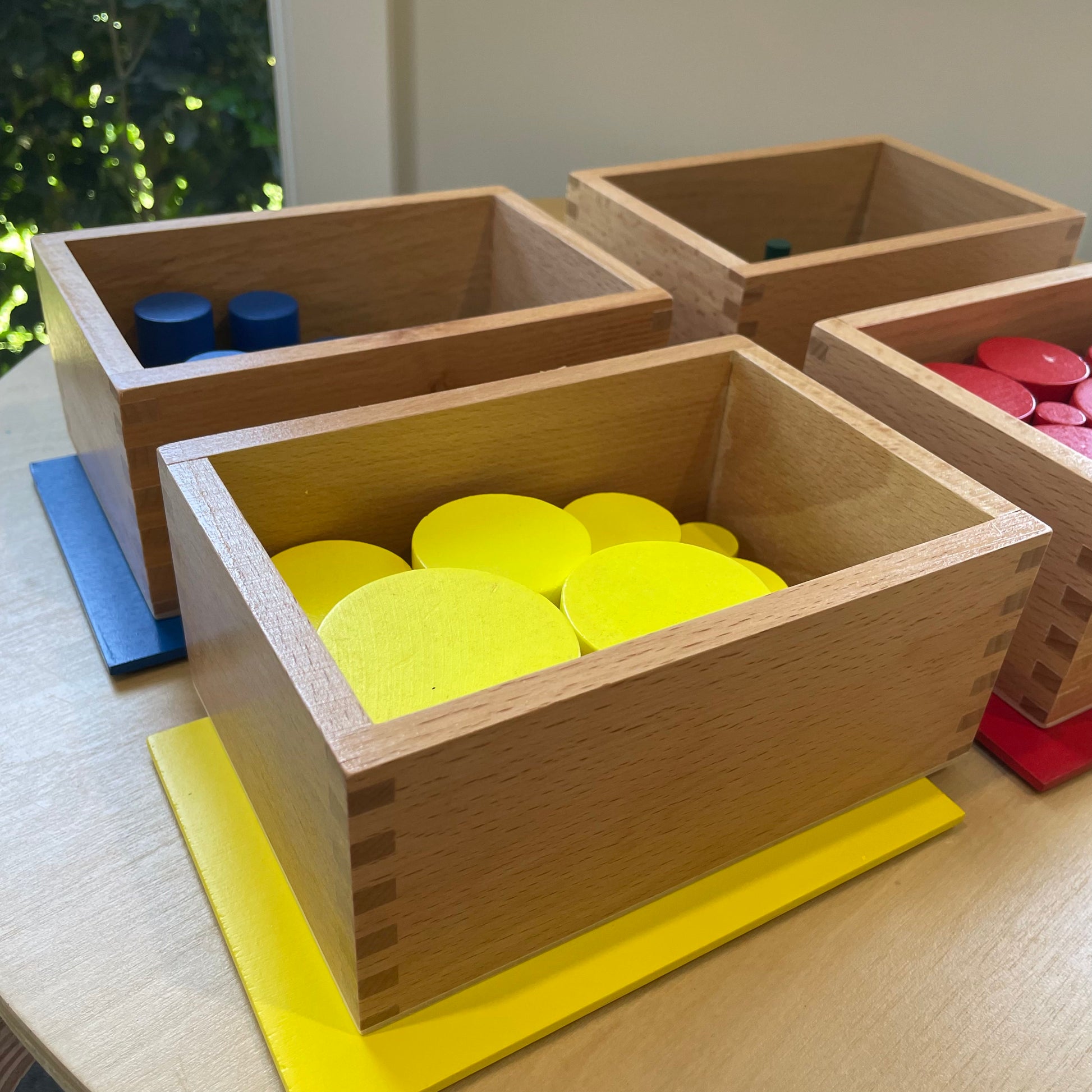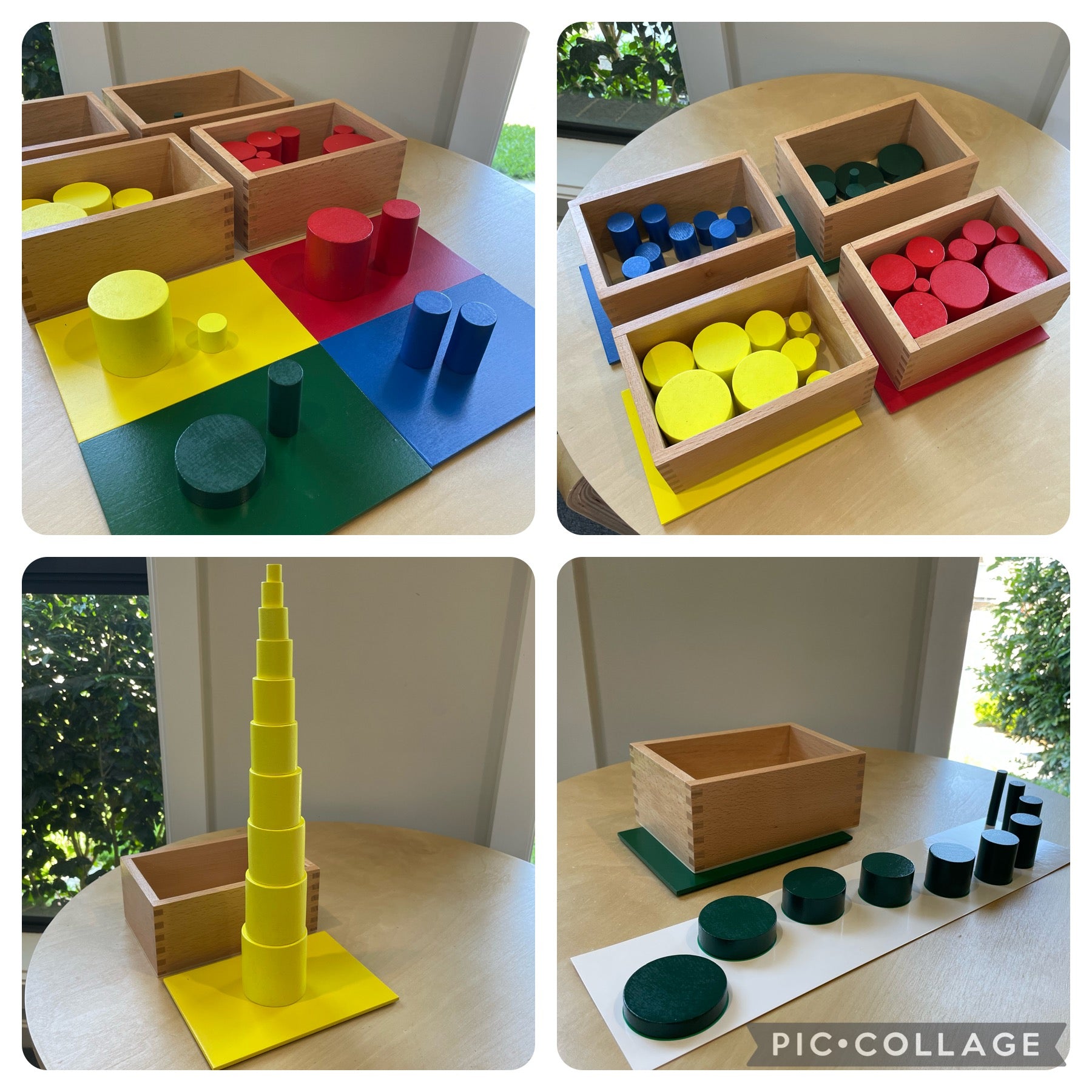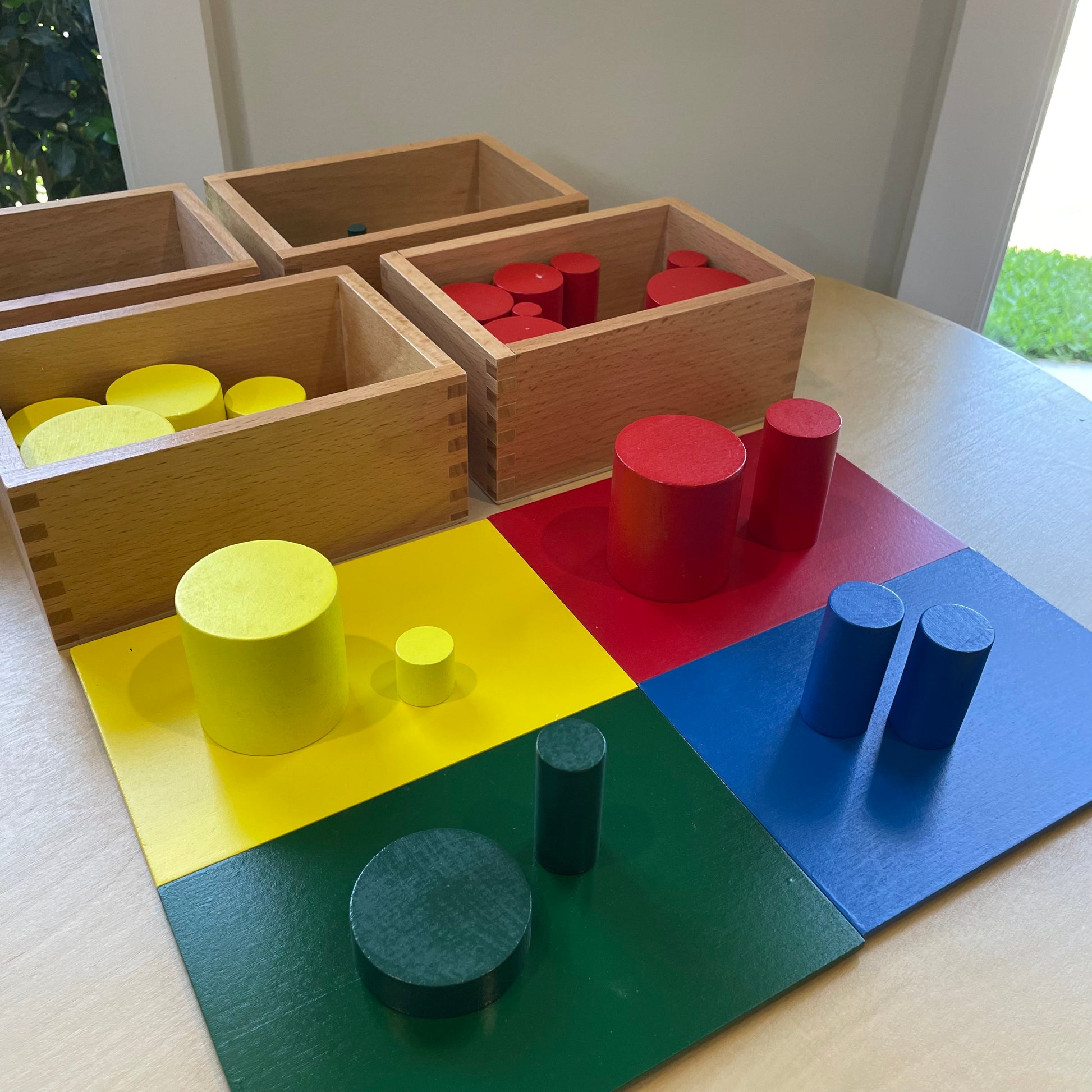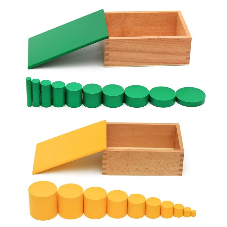 The Knobless Cylinders are the final stage in the dimensional material where the child, based upon his ability to discriminate, places the individual sets of cylinders in the correct order. Each set of ten cylinders are contained in a separate beechwood box with the lid painted the same color as the cylinders.