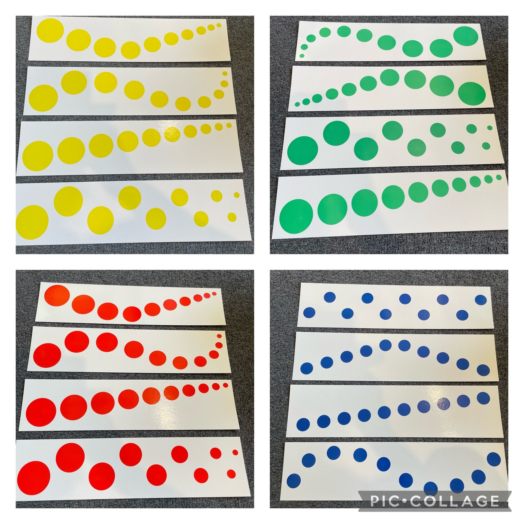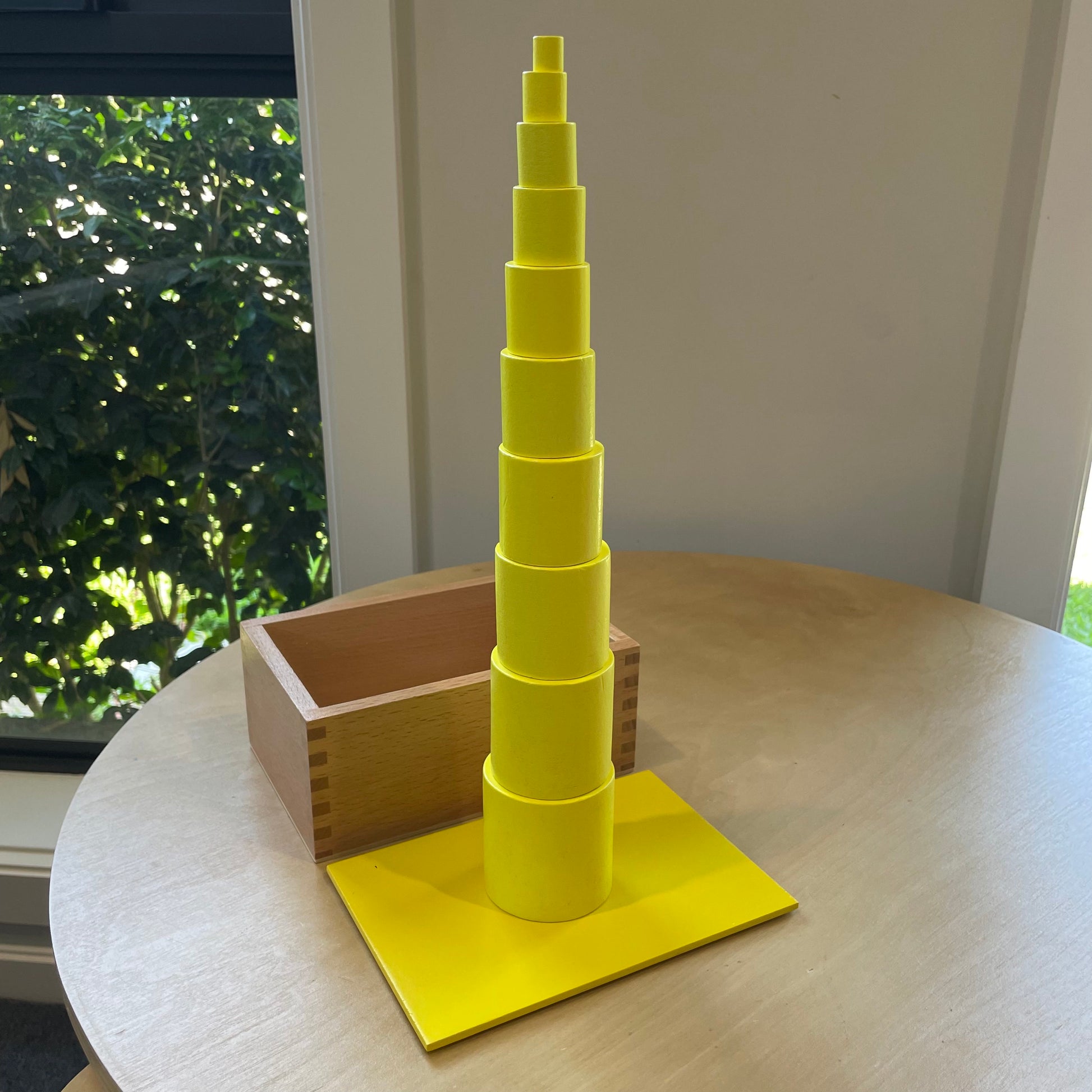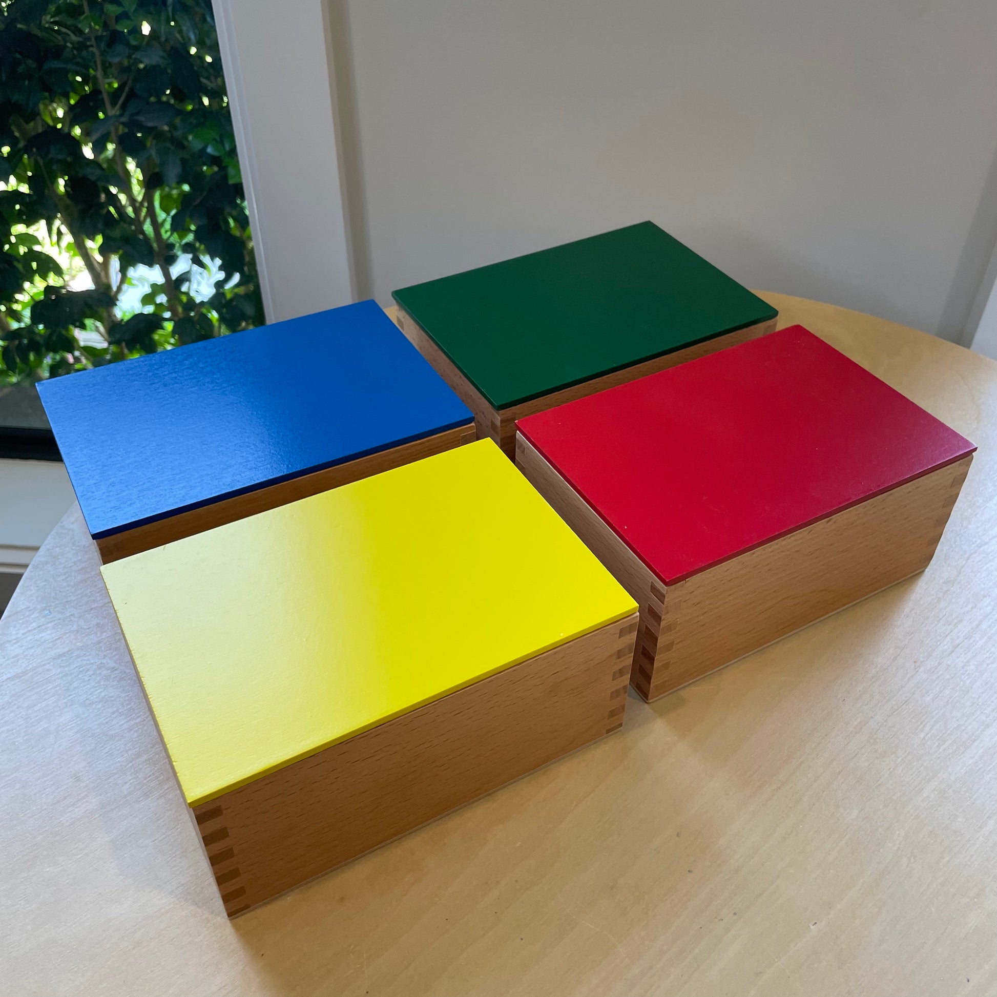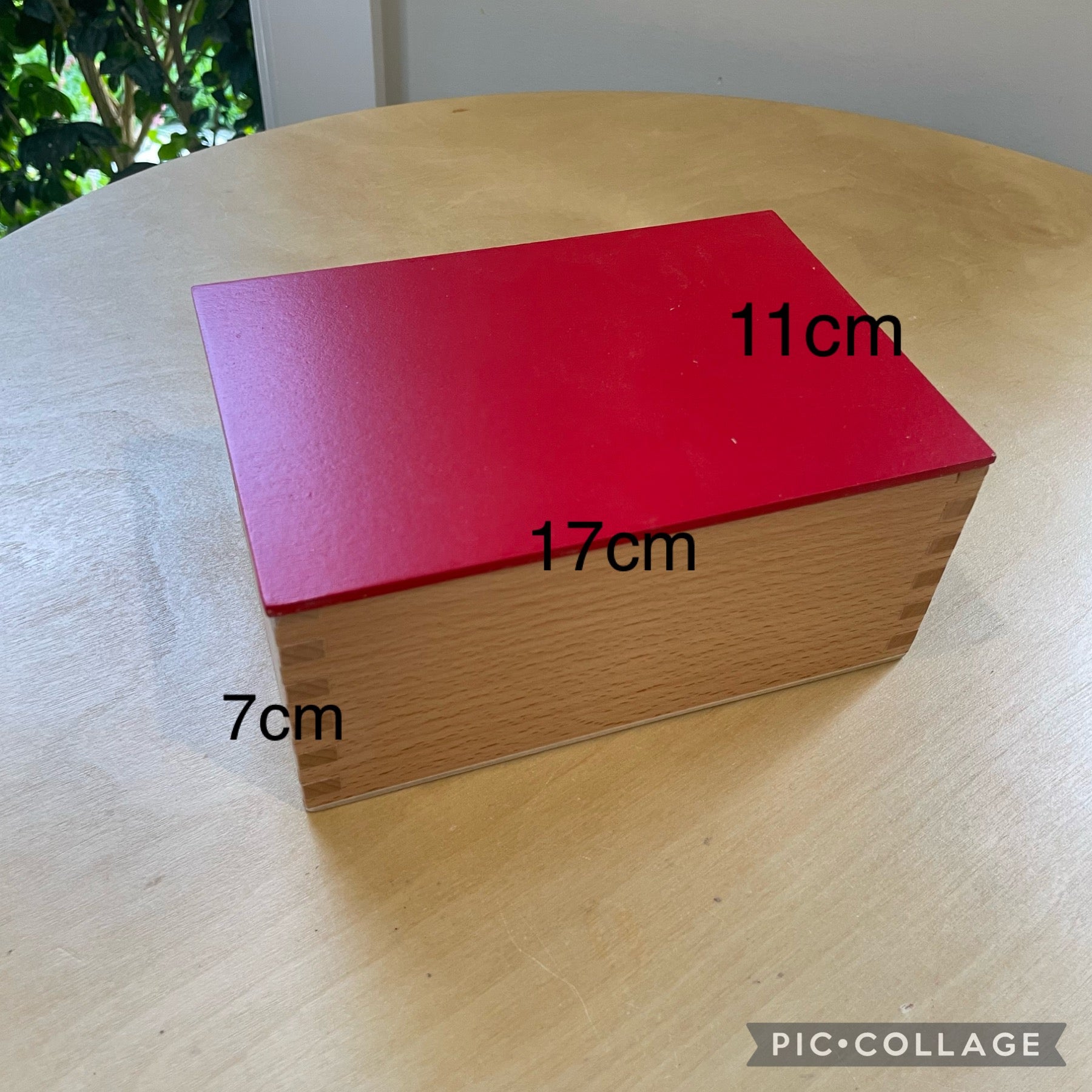 The Knobless Cylinders are the final stage in the dimensional material where the child, based upon his ability to discriminate, places the individual sets of cylinders in the correct order. Each set of ten cylinders are contained in a separate beechwood box with the lid painted the same color as the cylinders.