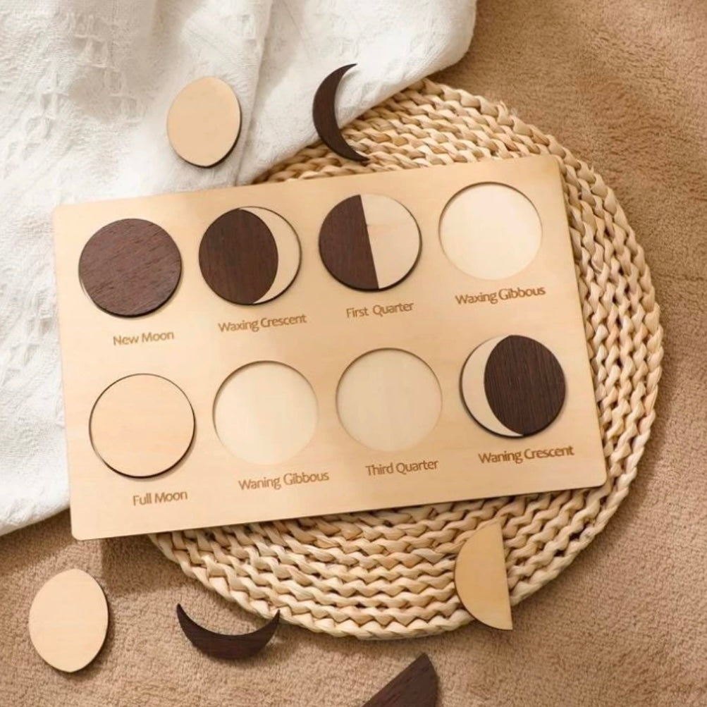 Spark curiosity with our kid-friendly Phases of the Moon Wooden Puzzle. Featuring durable wood pieces designed for small hands, it depicts the lunar cycle from crescent to full moon. Ideal for budding astronomers, this puzzle encourages learning through play. Perfect as a gift, it ignites fascination with the cosmos in young explorers.