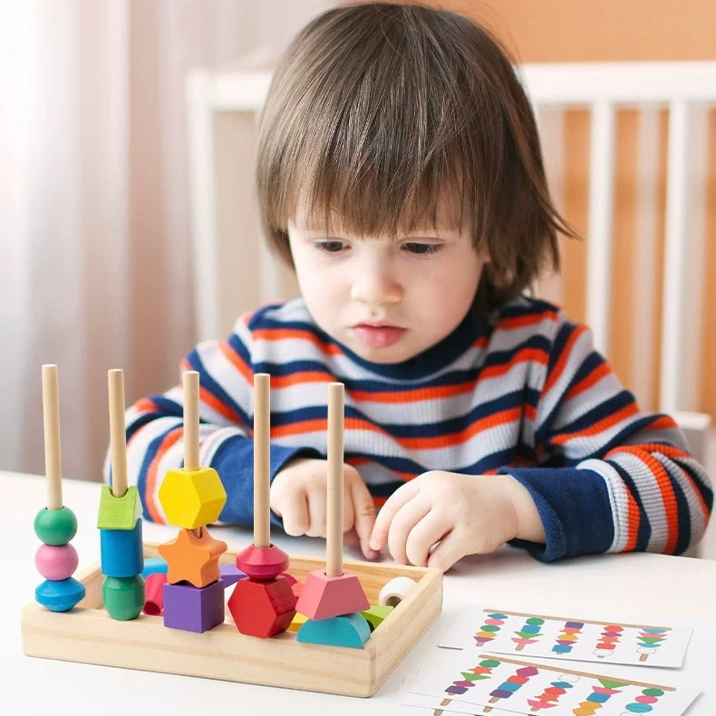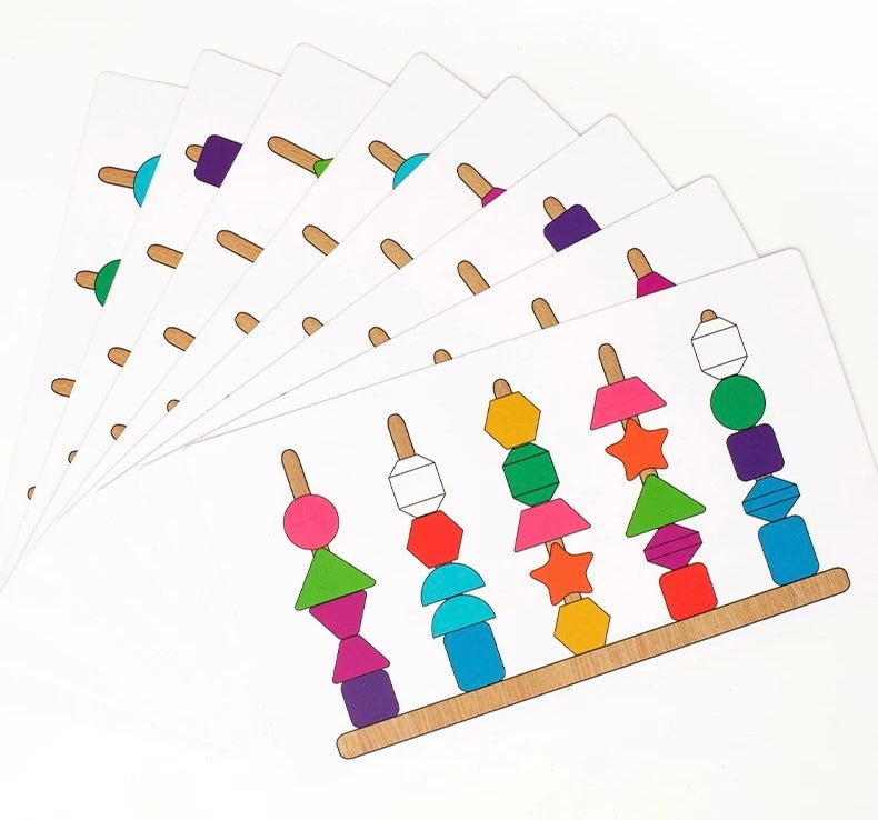 This versatile wooden set is designed to support shape recognition, hand–eye coordination, and fine motor skills. Children can practise stacking shapes by fitting them onto the wooden poles or take on an extra challenge by following the matching activity cards.
