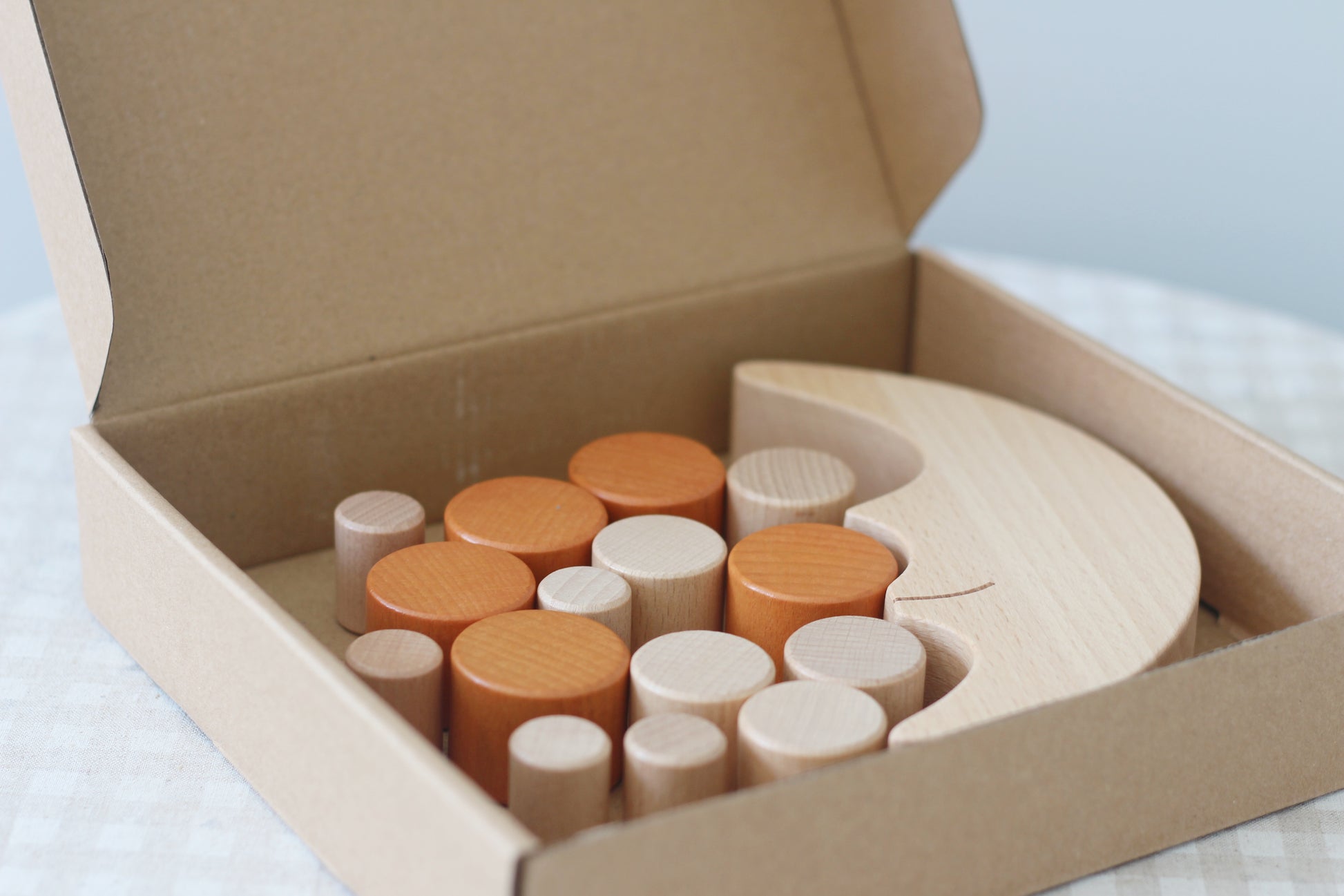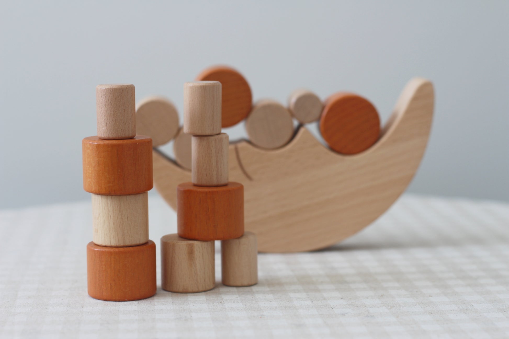 The Wooden Balancing Moon is a beautifully crafted toy featuring a moon-shaped pedestal and cylindrical pieces. Made from high-quality wood in natural shades, it promotes calm, balance, and coordination. Kids can stack the pieces without tipping the moon, or use them for sorting shapes and sizes, offering versatile, engaging play.
