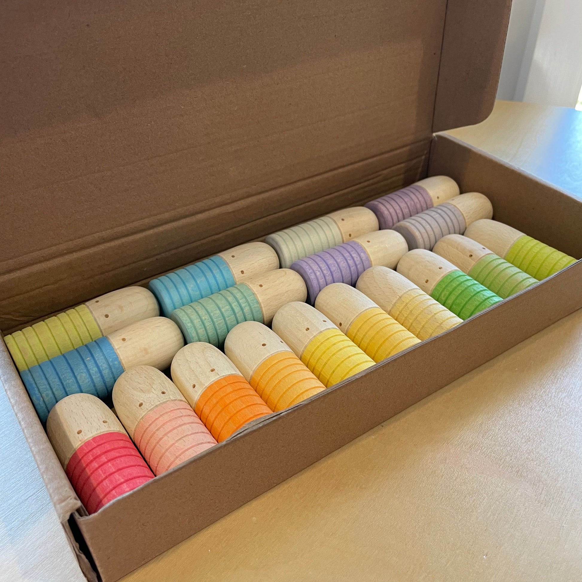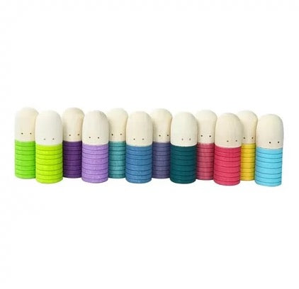 Our set of 18 Rainbow Pastel Wooden Peg Dolls are made from solid wood, offers 6 colors in 3 shades each. These charming pieces, reminiscent of classic peg dolls, are versatile for imaginative play, storytelling, and learning activities like counting and sorting. Their simple design fosters creativity, allowing children to explore expression, gender, and roles, nurturing emotional development and understanding of the world.